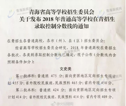 2018年青海高考分数线二本文科424分理科365分