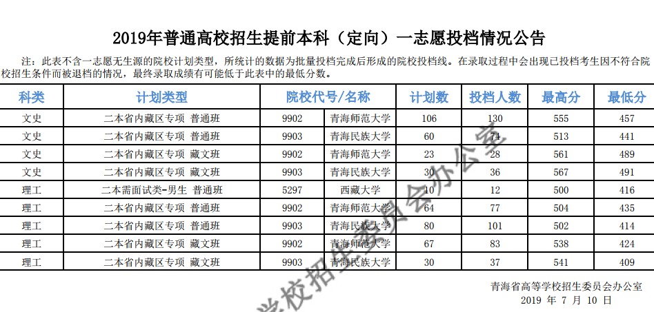 2019年普通高校招生提前本科(定向)一志愿投档情况公告