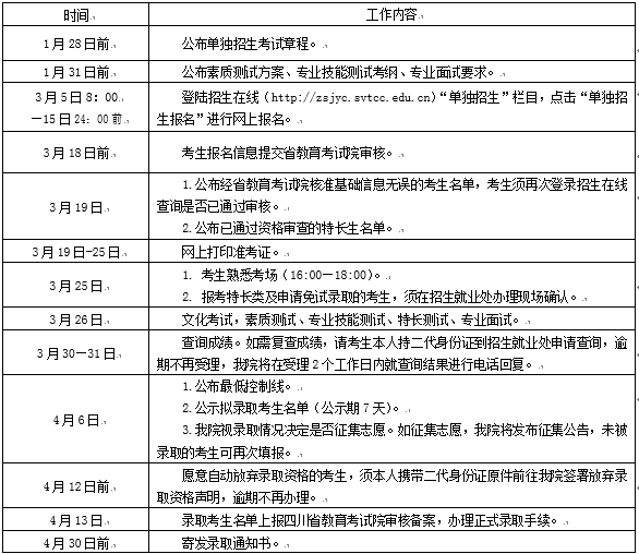 (一)报名时间、网址:符合报名条件的考生应于3月5日8:00—15日24:00前,登陆招生在线(http://zsjyc.svtcc.edu.cn)“单独招生”栏目,点击“单独招生报名”进行网上报名。