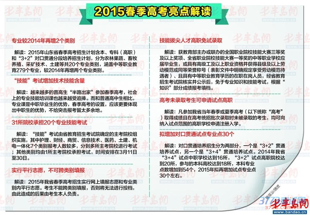 半岛都市报3月16日讯(记者 郭玉华) 16日,省教育厅举行春季高考新闻通气会,并解读相关政策。记者了解到,今年春季高考共划分20个专业类别,各专业类别报考总人数为110885人,比2014年增加近2万人,其中护理最“热”,采矿最“冷”。技能考试将增加技术技能含量,分值为230分。 记者了解到,2014年的技能考试是按专业类目进行的,共分成38个类目,但专业类目分得过细,各类目实操考试分数缺乏可比性,不利于选拔人才,因此2015年调整为按专业类别组织技能考试。 2015年春季高考“知识”部分的考试科目为语文(120分)、数学(120分)、英语(80分)、专业知识(200分)。考试时间:5月9日9:00~11:00考语文,14:30~16:30考专业知识;5月10日9:00~11:00考数学,14:30~15:30考英语。另外,2015年我省高职院校单独招生规模与去年基本持平,招生院校保持42所不变,安排招生计划36700人。 为了规范高校春季高考招生行为,省招考院提出各高校不得发布未经主管部门备案的招生章程或者进行虚假招生宣传、不得无计划或擅自突破计划规模进行招生或违反计划管理要求调整计划等12条要求。同时,各高校要在公示有关信息的同时,提供举报电子邮箱、电话号码、受理举报的单位的通讯地址,并按照国家有关规定及时调查处理。 (来源:半岛网-半岛都市报)