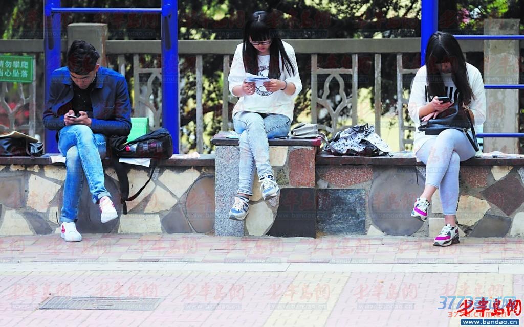 9日中午,考生们在电子学校考点外的社区广场复习,迎接下午的考试。