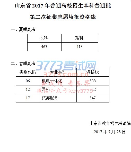 山东省2017年普通高校招生本科普通批第二次征集志愿填报资格线一、夏季高考文科 理科463 413