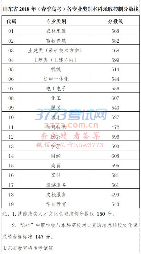 山东省2018年(春季高考)各专业类别本科录取控制分数线