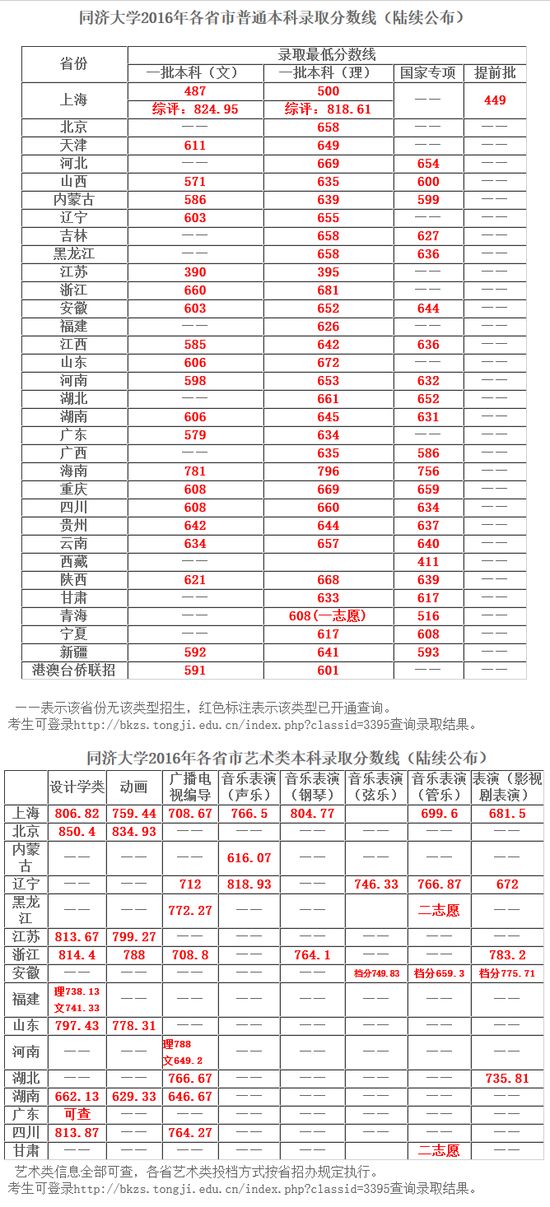 同济大学2016年各省录取分数线