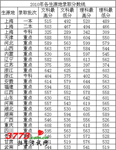 上海对外贸易学院2010年各省录取分数线