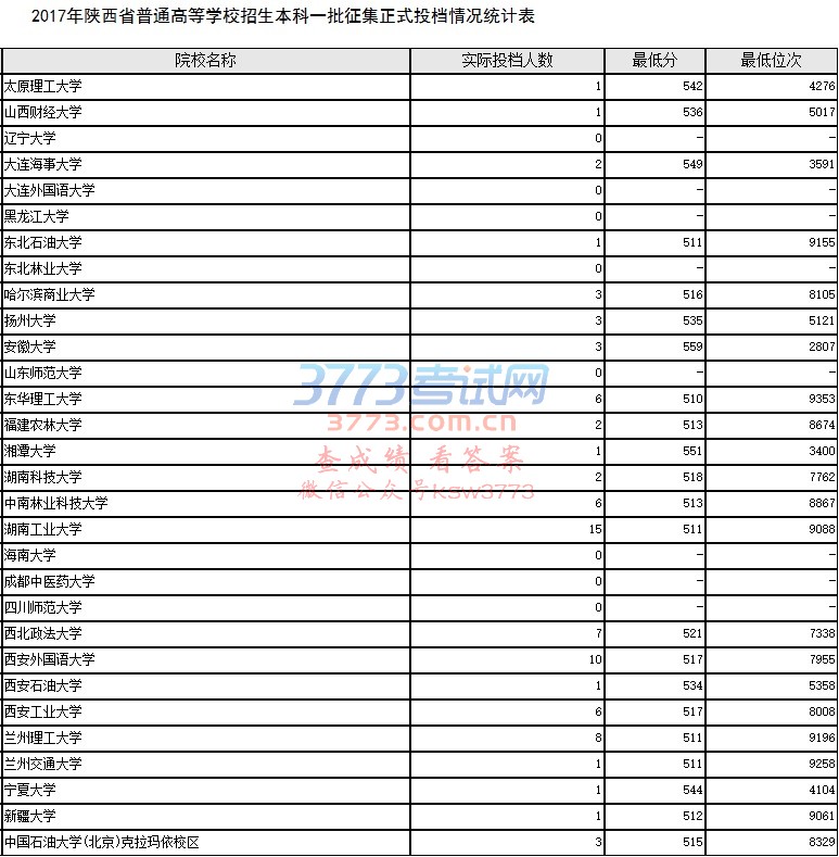 2017年陕西省普通高等学校招生本科一批征集正式投档情况统计表