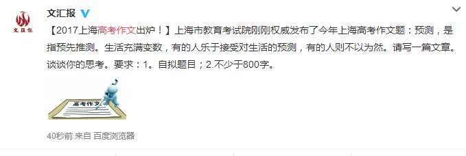 上海市教育考试院刚刚权威发布了今年上海高考作文题:预测,是指预先推测。生活充满变数,有的人乐于接受对生活的预测,有的人则不以为然。请写一篇文章。谈谈你的思考。要求:1。自拟题目;2.不少于800字。