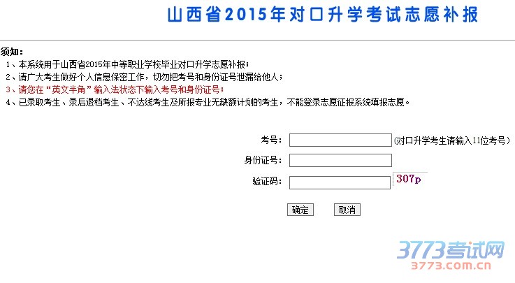 考生须知: 1、本系统用于山西省2015年中等职业学校毕业对口升学志愿补报; 2、请广大考生做好个人信息保密工作,切勿把考号和身份证号泄漏给他人; 3、请您在“英文半角”输入法状态下输入考号和身份证号; 4、已录取考生、录后退档考生、不达线考生及所报专业无缺额计划的考生,不能登录志愿征报系统填报志愿。考号: (对口升学考生请输入11位考号)身份证号: 验证码: