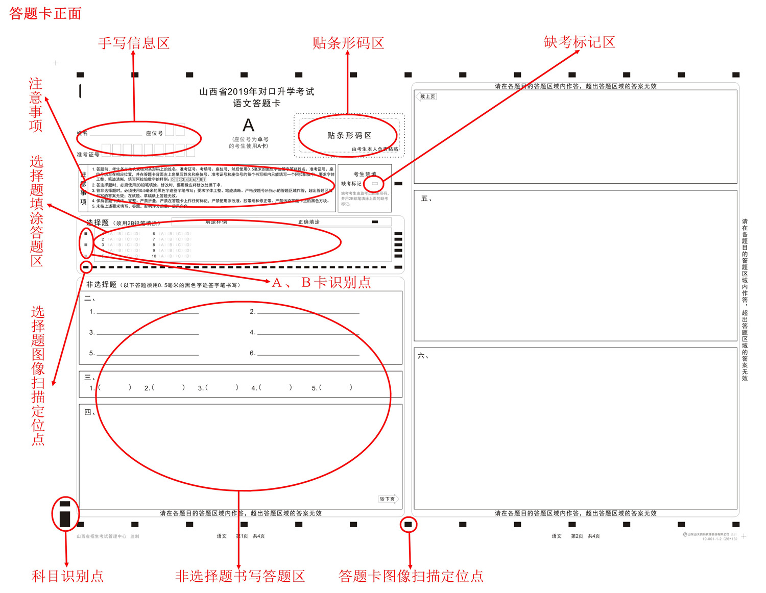 答题卡卡面包括手写信息区;贴条形码区;注意事项区;缺考标记区;选择题填涂答题区;非选择题书写答题区;选择题图像扫描定位点;A、B答题卡识别点(限语文、数学、英语答题卡);答题卡图像扫描定位点;科目识别点;背面卡头手写信息区共十一个部分。样卡如下: