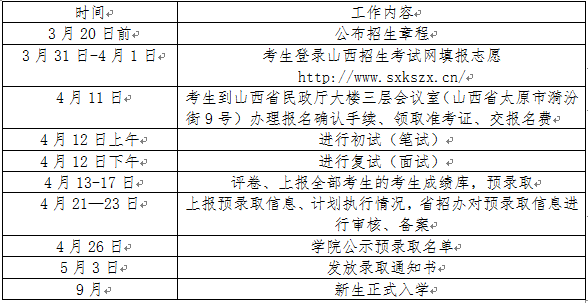 1、考生报名采用网上报名和现场确认的方式进行。考生在3月31日-4月1日内登录山西招生考试网http://www.sxkszx.cn//填报志愿进行网上报名,然后持本人二代身份证、网报号、报名考试费和一张1寸免冠彩色照片,在规定时间内到我校指定的报名点办理报名资格确认手续,领取准考证;