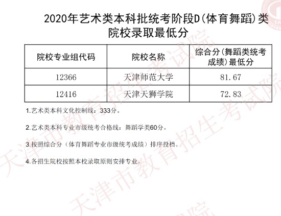 2020年艺术类本科批统考阶段D(体育舞蹈)类院校录取最低分