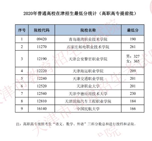 普通类高职(专科)院校提前批录取最低分天津市教育招生考试院