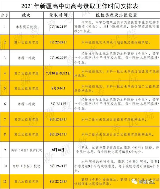 2021年新疆高中班高考录取工作计划于7月18日开始,预计8月24日结束,设本科提前批次、本科一批次、本科二批次、高职(专科)提前批次和高职(专科)批次5个录取批次。各批次正式投档录取结束后,根据院校剩余计划情况分别安排1次或2次网上征集志愿。