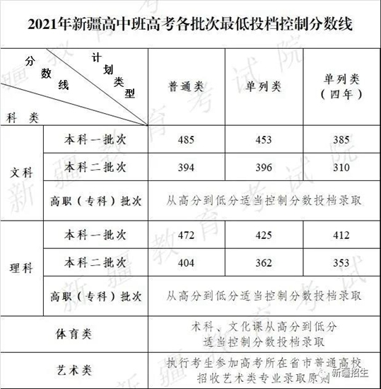 根据普通高校招收新疆高中班招生计划数、考生成绩、录取投档等情况,研究确定新疆高中班高考各批次最低投档控制