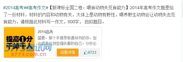 今日高考进入第一天,新课标全国二卷作文题目已经在微博风传。作为题目:喂食动物失觅食能力。