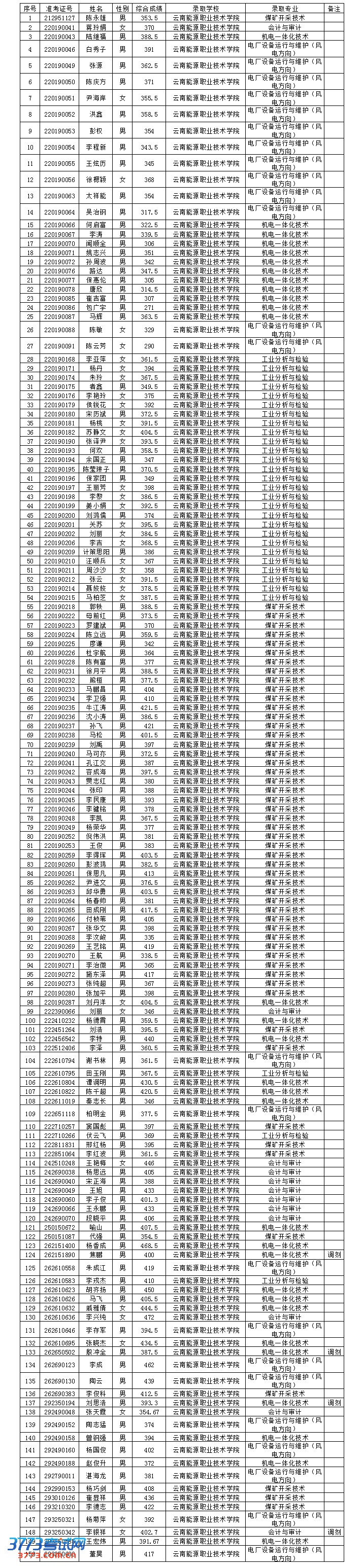 云南能源职业技术学院2013年单独招生录取名单