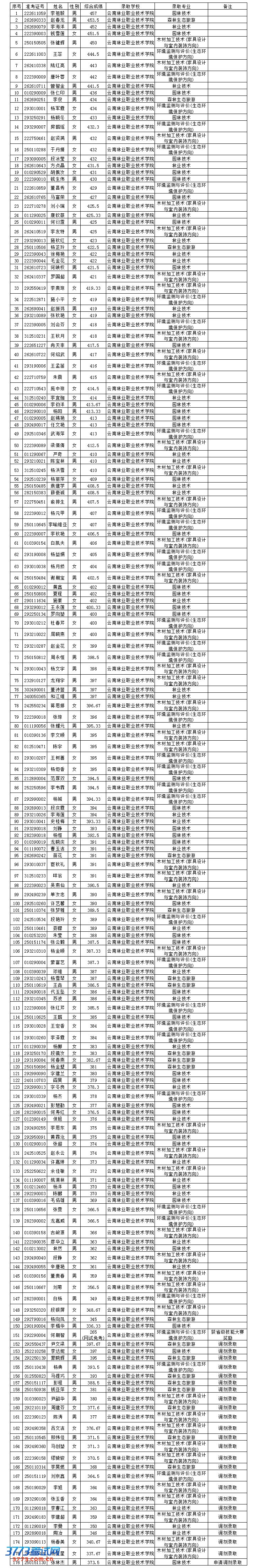 云南林业职业技术学院2013年单独招生预录取名单