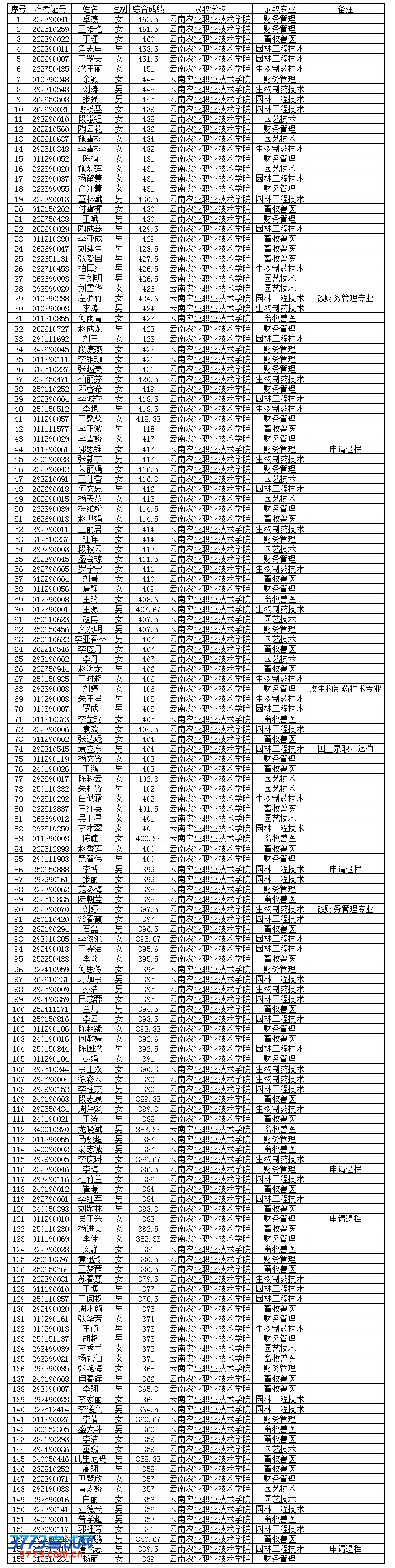 云南农业职业技术学院2013年单独招生预录取名单