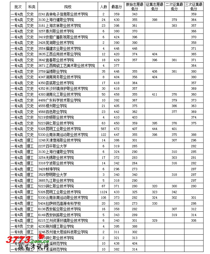 2012年云南高考第一批专科A类第三次征集志愿招生计划
