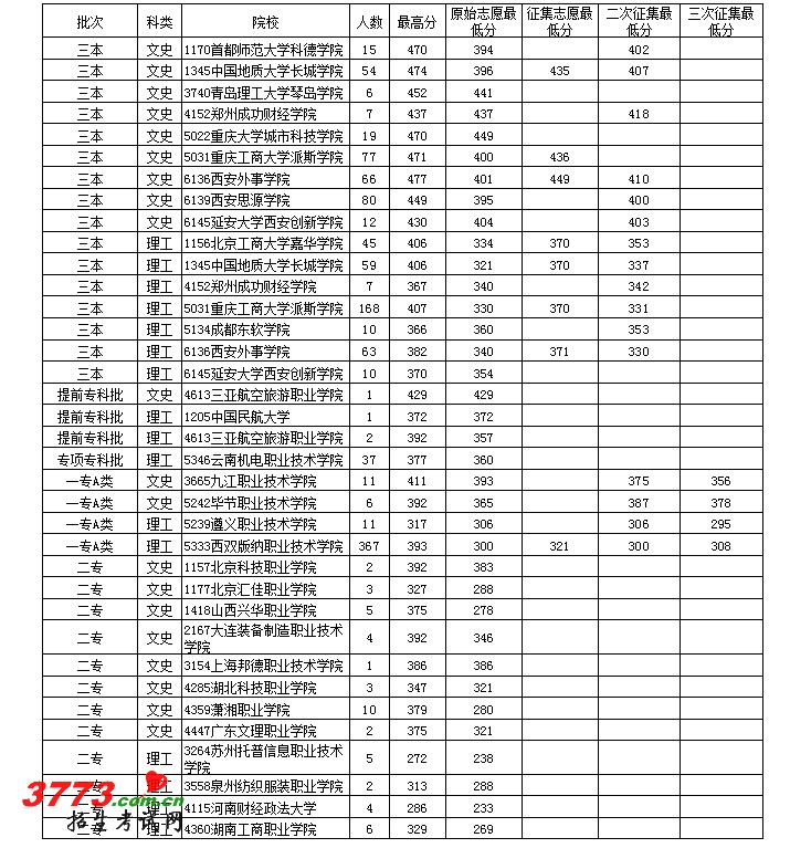 2012年云南高考第一批专科A类第三次征集志愿招生计划