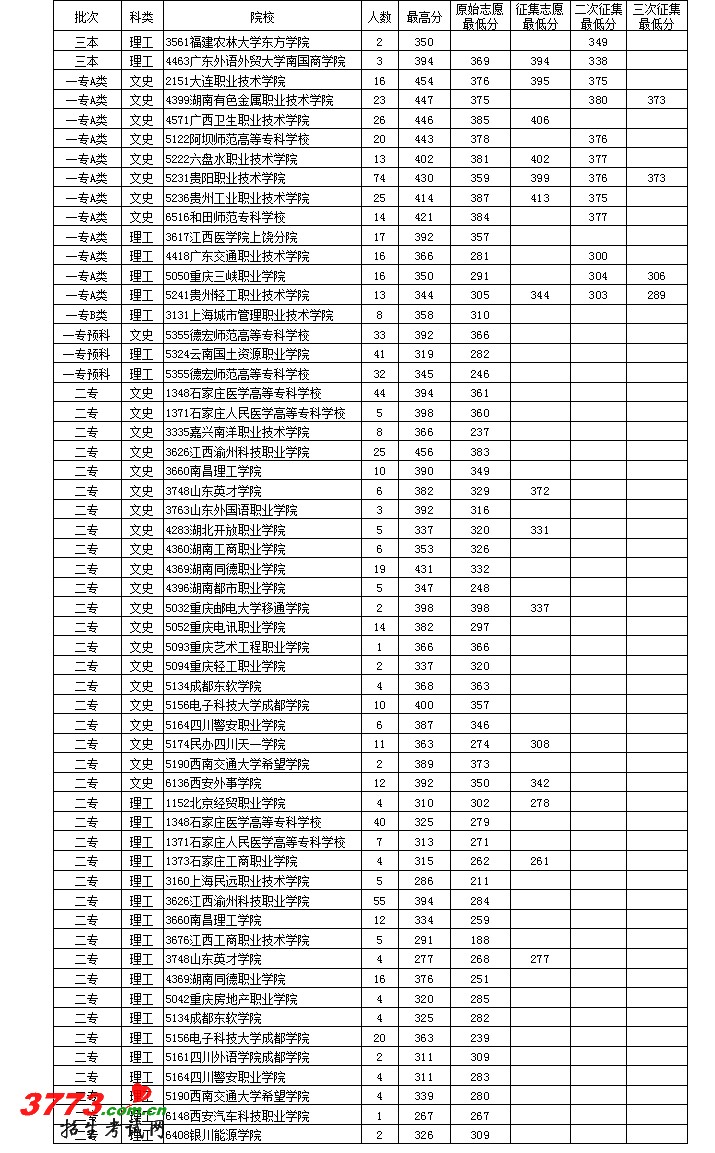 2012年云南高考第一批专科A类第三次征集志愿招生计划