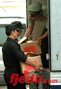 北京2007年高考试卷从印刷厂运抵各区县考试中心,并存入保密室。每个保密室将有两名民警和两名考务人员随试卷进驻,24小时值守。本报记者 王庆钦 摄