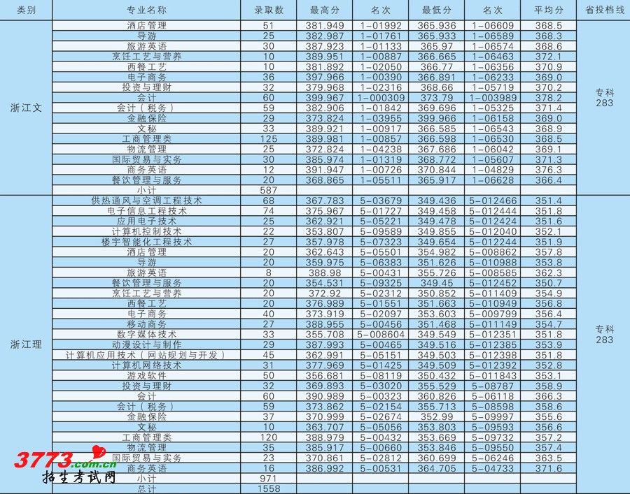 浙江商业职业技术学院2011年浙江各专业录取分数线