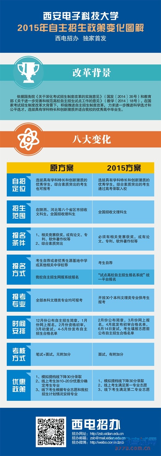 西安电子科技大学《2015年自主招生简章》已经发布,2015年我校自主招生范围、报名条件、报名方式、报考专业、报名及考试时间、考核方式和录取优惠政策等方面有重大变化,详见以下图解。
