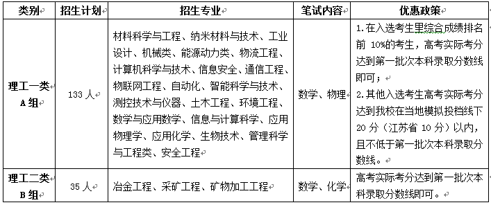自主招生面向全国招生,专业为我校理工科的特色专业,分为理工一类和理工二类,分别含不同专业和优惠政策,具体详见表1。
