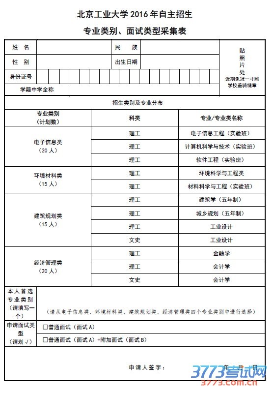 (1)《北京工业大学2016年自主招生专业类别和面试类型采集表》。