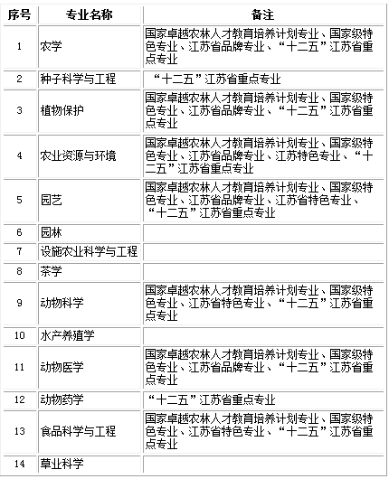 农学、种子科学与工程、植物保护、农业资源与环境、园艺、园林、设施农业科学与工程、茶学、动物科学、水产养殖学、动物医学、动物药学、食品科学与工程、草业科学。