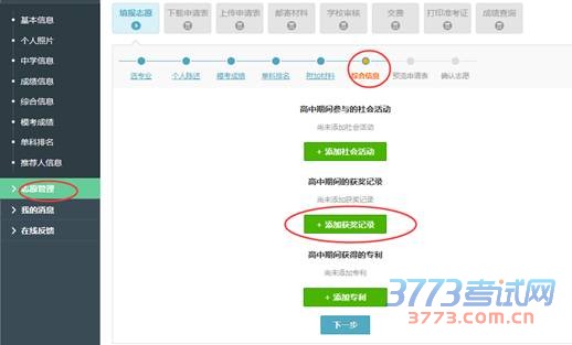 考生也可在志愿填报过程中,在“综合信息”栏中点击“添加获奖记录”,在生成的页面中填写并上传高中阶段发表论文等证明材料,如图2;