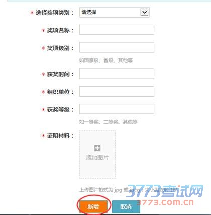 获奖记录填写界面如图3所示,请按照要求,填写各项信息,填写完整后,点击“新增”。