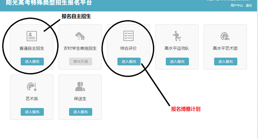 答:考生注册并登录“阳光高考特殊类型招生报名平台”,在“普通自主招生”选择自主招生报名,在“综合评价”里选择博雅计划报名。如图所示: