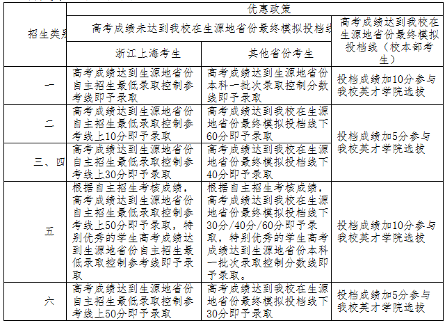取得我校自主招生资格的考生必须参加高考,且高考成绩达到生源地省份本科第一批次录取控制分数线上,可在自主招生指定志愿位置填报公示专业,我校按如下录取条件录取:
