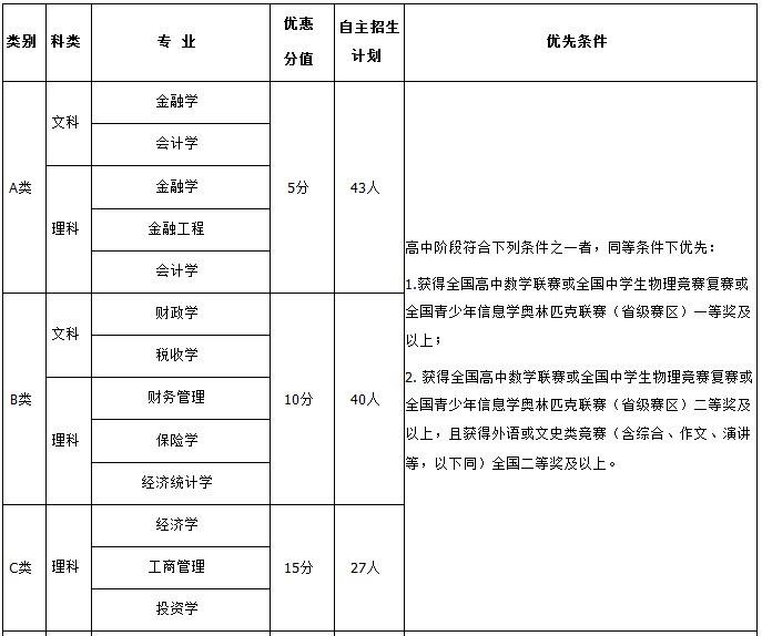我校2017年自主招生专业分A、B、C、D四类,自主招生计划数控制在全校年度本科招生计划总数的5%(即125人)以内。