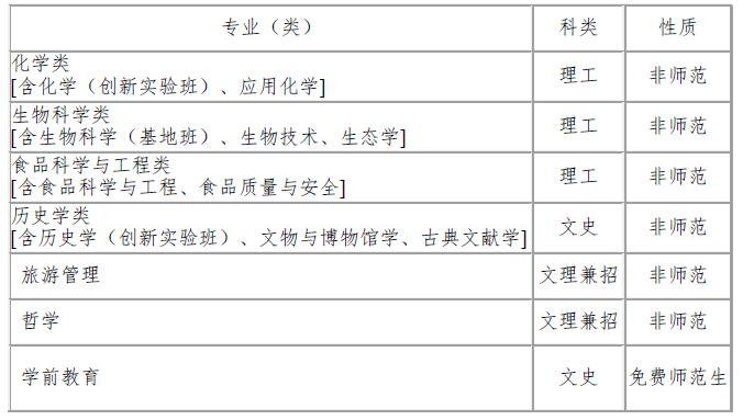 1.化学类、生物科学类、食品科学与工程类、历史学类按专业类招生;旅游管理、哲学、学前教育按专业招生。