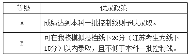 我校对取得自主招生认定资格的考生依据测试结果给予相应的优录政策。经我校测试认定为“优秀”者享受A等优录政策,“合格”者享受B等优录政策,其中享受A等优录政策的人数比例不超过公示人数的40%。填报高考志愿时,具体填报方式、填报时间等以生源所在地省级招生考试机构规定为准。填报专业志愿时,应填报公示入选专业。学校将根据入选资格考生自主招生志愿、高考成绩总分、经公示的优惠分值、入选专业和学校模拟投档线决定录取与否。模拟投档线由生源地省级招办按照本科一批招生所有高校在该省(区、市)最终确定的投档比例测算生成。对于合并本科批次的省份,“本科一批控制线”按相关省级教育行政部门或招生考试机构确定的自主招生相应最低录取控制分数线执行。江苏省考生选测科目等级要求为2B,必测科目等级要求为4C1合格。