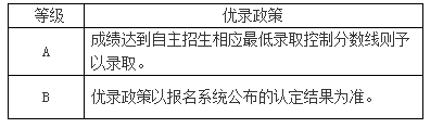 我校对取得自主招生认定资格的考生依据测试结果给予相应的优录政策。经我校测试认定为“优秀”者享受A等优录政策,“合格”者享受B等优录政策,其中享受A等优录政策的人数比例不超过公示人数的40%。填报高考志愿时,具体填报方式、填报时间等以生源所在地省级招生考试机构规定为准。填报专业志愿时,应填报公示入选专业。学校将根据入选资格考生自主招生志愿、高考成绩总分、经公示的优惠分值、入选专业和学校模拟投档线决定录取与否。模拟投档线由生源地省级招办按照本科一批招生所有高校在该省(区、市)最终确定的投档比例测算生成。对于合并本科批次的省份,“本科一批控制线”按相关省级教育行政部门或招生考试机构确定的自主招生相应最低录取控制分数线执行。江苏省考生选测科目等级要求为2B,必测科目等级要求为4C1合格。