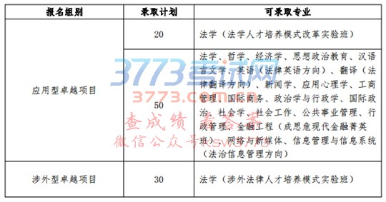 2.“应用型卓越项目”按照不超过计划数200%的比例单独划定入选线,入选线内排名前20名的考生获得入选法学(法学人才培养模式改革实验班)资格,在入选线内的其他考生获得入选“应用型卓越项目”其他专业资格。获得入选法学(法学人才培养模式改革实验班)资格的考生,可以放弃本类入选资格,选择入选“应用型卓越项目”其他专业资格;获得入选“应用型卓越项目”其他专业资格的考生可以选择放弃入选资格,但不能递补入选法学(法学人才培养模式改革实验班)专业资格。
