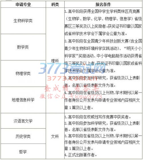 注:以上证书、奖项、论文、作品、著作等材料均于2018年3月26日前已获得或已出版见刊。以理科第4条,文科第3条作为报名条件的考生,须同时寄送社会团体或专家(教授或相当专业技术职务)的实名推荐材料,推荐内容要能够证明该考生的学科特长和专业培养潜质,推荐人或推荐单位须对其所推荐材料真实性负责。由社会团体推荐的材料需负责人签字,并加盖推荐单位公章;由专家个人推荐的材料需专家本人签字,并附专家所在单位对其专家资格认定的证明材料。