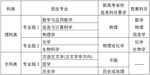我校强基计划设三个专业组8个专业,分别是数学与应用数学、信息与计算科学、物理学、化学、生物科学、汉语言文学(古文字学方向)、历史学、哲学。招生总计划为210人,分省计划见报名系统。实施新高考省份的第一类和第二类考生选考科目均应符合填报专业的科目要求。