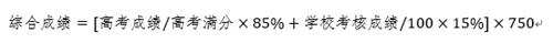 综合成绩(总分750.0分,精确至小数点后一位)由高考成绩和学校考核成绩两部分组成,折算办法如下: