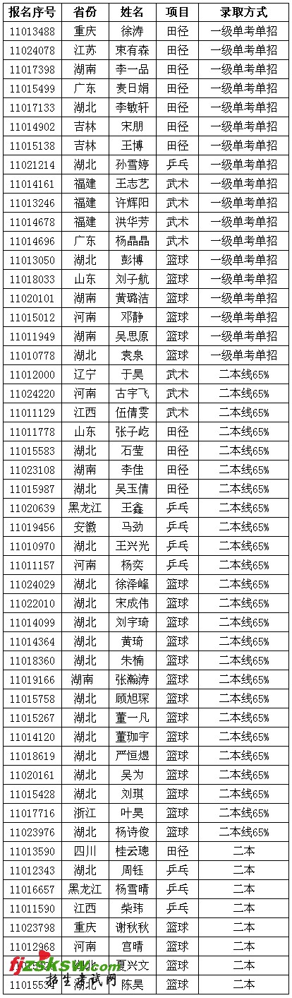根据《华中科技大学2011年高水平运动员选拔录取办法》,我校于2011年1月15日—1月17日举行高水平运动员运动水平测试。按照考生测试成绩及学校高水平运动队的建队需要,我校择优确定高水平运动员选拔入围名单。现将名单予以公示。如有异议请向我校学生工作处或监察处反映,监督电话:027-87542228,027-87543616。如发现学生有弄虚作假、舞弊等行为,经核实无误后即取消其资格,所产生的空缺名额不再递补。