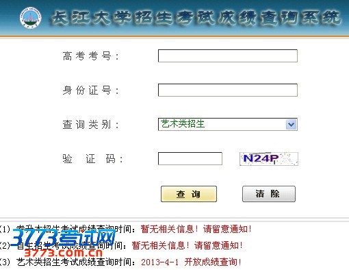 (1) 专升本招生考试成绩查询时间:暂无相关信息!请留意通知! (2) 自主招生考试成绩查询时间:暂无相关信息!请留意通知! (3) 艺术类招生考试成绩查询时间:2013-4-1 开放成绩查询! (4) 第二学士学位招生考试成绩查询时间:暂无相关信息!请留意通知! (5) 长江大学招生与注册处办公室咨询电话:0716-8060550