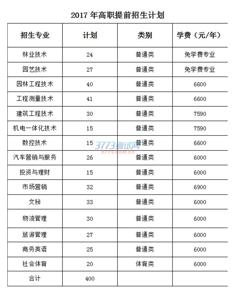 第五条 学校2017年高职提前招生总计划400名,具体招生的专业、计划、类别、学费如下表所示: