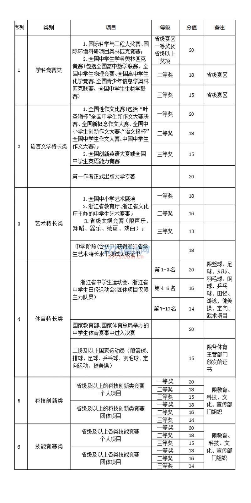 招生程序 第七条 报名条件:符合浙江省普通高校招生报名条件,且已取得浙江省普通高校统一招生考试高考报名号的应、往届普通高中毕业生,方可报名。其中社会体育专业只招体育类考生。 第八条 报名方式:高职提前招生考试遵循本人自愿的原则,采取网络报名、网络审核、现场确认的报名方式。 第九条 志愿填报:具备高职提前招生报名资格的考生请于3月4日8:00—4月2日17:00间登陆我校网站(www.lszjy.com)、我校招生网(http://zsw.lszjy.com)进入高职提前招生报名系统报名并填报志愿,每个考生只可选报一个专业参加职业能力适应性测试,按要求准确完整地填写所有资料,考生志愿以网络报名为准。 第十条 入围名单确定:依据考生报考志愿,以考生学业水平测试相关科目等第折算成绩从高到低,按各专业招生计划的500%确定入围考生名单,末位同分者一并入围。若某专业的报考人数未超过该专业招生计划的500%,则全部入围。入围名单于4月4日下午17:00前(若延迟详见公告)公布在学校招生网。 第十一条 报名费缴纳:已入围考生须缴纳报名考试费110元,不缴费的考生报名无效。缴费方式统一通过我校提前招生报名系统缴费,不接受现金缴费,缴费截止时间为4月10日24:00,过期不予受理缴费事宜。 第十二条 下载准考证:已缴费考生在4月12日8:00─4月15日15:00凭个人相关信息从我校高职提前招生网相关栏目下载准考证,现场确认时盖章方有效。 第十三条 现场确认 1.确认时间:4月15日9:00-15:00 2.确认地点:丽水职业技术学院(丽水市莲都区中山街北357号) 3.确认内容:考生身份、资格确认。考生须提交以下材料(复印件以A4纸格式): (1)高职提前招生准考证; (2)身份证原件及复印件; (3)《普通高校招生报名证》原件及复印件; (4)考生诚信考试承诺书(可在学校招生网下载)。考生必须在规定时间内由本人进行现场确认,不进行现场确认的考生,视作自动放弃处理。因材料不全无法进行现场确认的考生,视作无报考资格。报名材料及报名费一概不退。 第十四条 学业水平测试(高中会考)相关科目等第成绩折算实行指定课目核定,总分180分,各相关专业的核定课程如下表: 学业水平测试(高中会考)科目满分为30分,具体标准如下表: 注:1.浙江省考生的学业水平测试(高中会考)中相关科目等第以浙江省教育考试院会考主管部门提供的相关成绩信息为准,对于外省转入浙江省参加高考的考生其学业水平测试成绩必须经过浙江省教育考试院认定,未经过浙江省教育考试院认定的须出具外省省级主管部门盖章的成绩证明,否则我校不予承认,计为0分。 2.往届生的学业水平测试技术科目成绩为:技术成绩=信息技术成绩*50%+通用技术成绩*50%。 第十五条 职业能力适应性测试职业能力适应性测试由我校自主命题,考生务必同时携带盖有我校招生就业处印章的准考证、身份证方可参加职业能力综合测试,缺其中任一证则不得参加考试。具体事项如下: 1.测试时间:4月15日-4月16日。 2.测试地点:丽水职业技术学院(丽水市莲都区中山街北357号)。 3.测试形式:分专业进行,以面试或笔试为主,结合其他测试办法(具体形式见各专业职业能力适应性测试办法)。 4.测试内容:考察学生综合素质及专业发展潜质为主,主要考核内容为:(1)专业认知;(2)专业潜能;(3)专业精神;(4)素质特长;(5)沟通表达能力;(6)实践创新能力。 5.总分:120分。 第十六条 素质特长项成绩鼓励具有特长并在各类比赛中表现突出的考生报考我校,在高中阶段,凡符合下列条件之一者,可在素质特长项中获得相应的成绩;同一考生如符合多项素质特长项成绩的,同类项只取最高分项;不同类项可累计得分,但累计最高不超过20分。(满分20分): 第十七条 录取 1.录取规则: (1)学校严格遵守教育部和省招生主管部门的有关招生录取工作政策和规定,实施“阳光工程”,严格执行招生工作“六公开”、“六不准”,坚持德智体美全面考核、综合评价,公平、公正、择优录取的原则。 (2)对考生的身体健康要求,参照《普通高等学校招生体检工作指导意见》的规定执行。凡考生体检符合“学校可以不予录取”条款的,学校将按“不予录取”执行。 (3)录取新生的男女生比例不限。 (4)录取总分(满分300分)=学业水平测试(高中会考)相关科目折算成绩(按照等第折算,满分180分)+职业能力适应性测试成绩(满分120分)。 (5)根据专业志愿优先的录取原则按照考生录取总分从高分到低分排序,择优录取,直到录取额满为止。录取考生名单在学校招生网(http://zsw.lszjy.com)和浙江省教育考试网上同步公示。 (6)我校根据各专业招生计划的300%确定各专业的录取及备录取名单。 (7)结合我校专业学习实际,考生在总分相同的情况下,首先按照职业能力适应性测试总分高低顺序,其次按学业水平测试科目总分高低顺序,再次按各相关专业学业水平测试科目次序的单科成绩等第择优录取。经上述排序后分数仍相同,我校将参考高中学业水平测试综合素质评价、在校表现等方面的内容择优录取,具体由学校高职提前招生工作领导小组决定。 (8)高中阶段具备相关选修课程学分或相关选修课程成绩优良的,在同等条件下优先录取。 2.根据“一档多投”相关规定,凡被高职提前招生考试拟录取的考生,在规定时间内登录浙江省教育考试院网站相关平台,选择确认1所录取院校。已被高职提前招生考试录取的考生,不得参