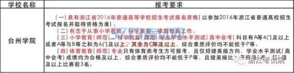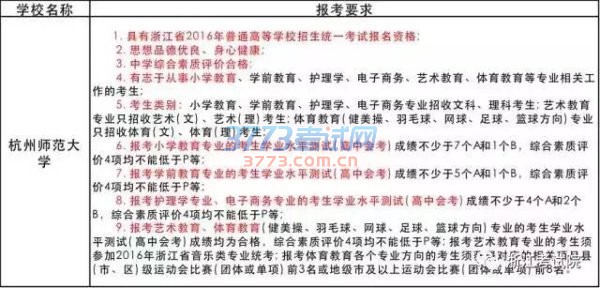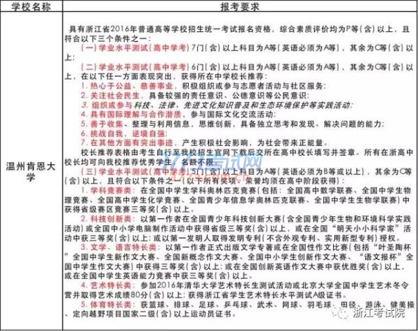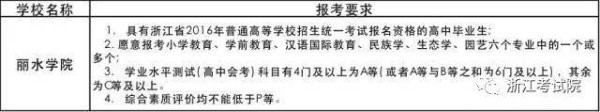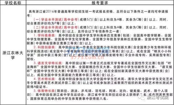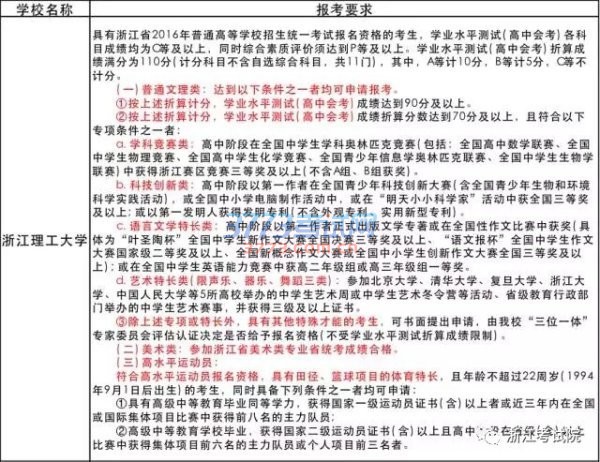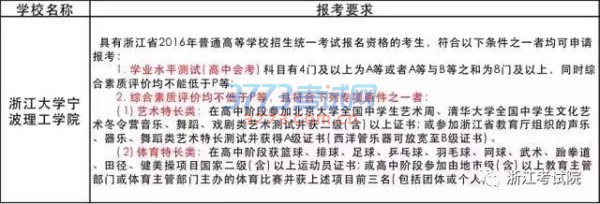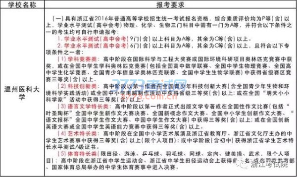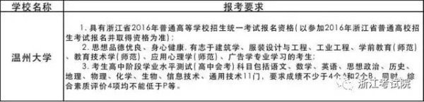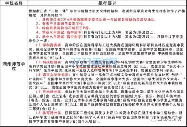 浙江大学:符合2016年浙江省普通高等学校招生全国统一考试报名条件,通过各科目高中学业水平考试(无不合格科目),浙江省2016年普通高中优秀应届毕业生。“三位一体”录取考生的高考成绩必须位于2016年浙江省普通高校文科考生前2%、理科考生前4%。