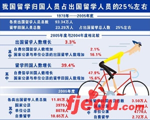 据统计,截至2006年底,我国各类出国留学人员总数达106.7万人,留学回国人员总数达27.5万人,其中,2006年回国人员总数为4.2万人,比2005年增长21.3%,回国人数呈逐年上升趋势。