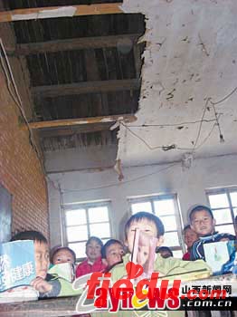 赵校长介绍,自从2001年原来的村小学被确定为危房后,小学便搬到原上社乡政府这个旧院子。房子是上世纪50年代建成的,一直是上社乡政府的办公场所,2000年撤乡并镇后上社乡划归解原乡,空出来的房子让学校临时占用,“房顶经常往下掉土渣”。去年的一天,他正在上课,无意中用手推了一把墙,没想到墙竟晃动起来,他赶紧让学生撤出教室,换到另一间教室。